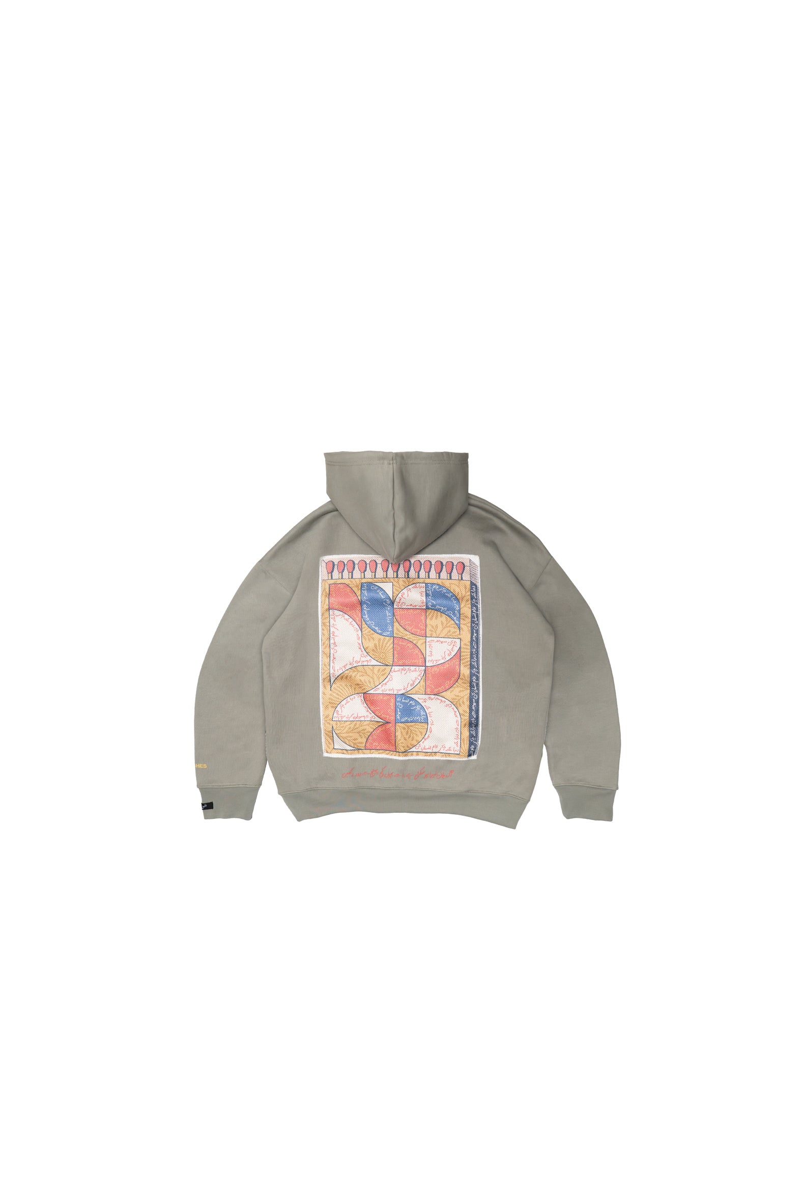 The back hosts a detailed digital matchbox artwork patch, designed in an expressive Urdu doodle style.