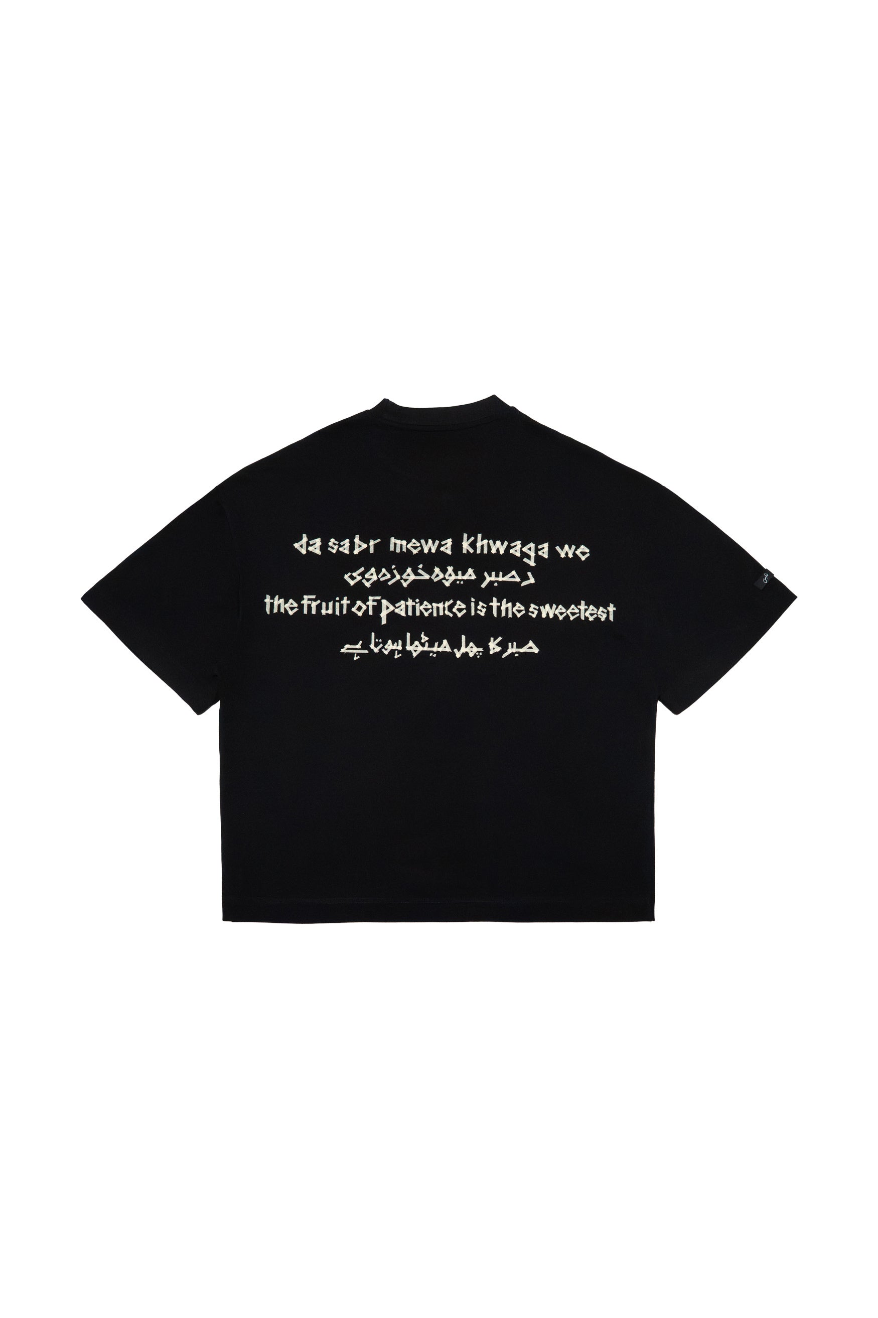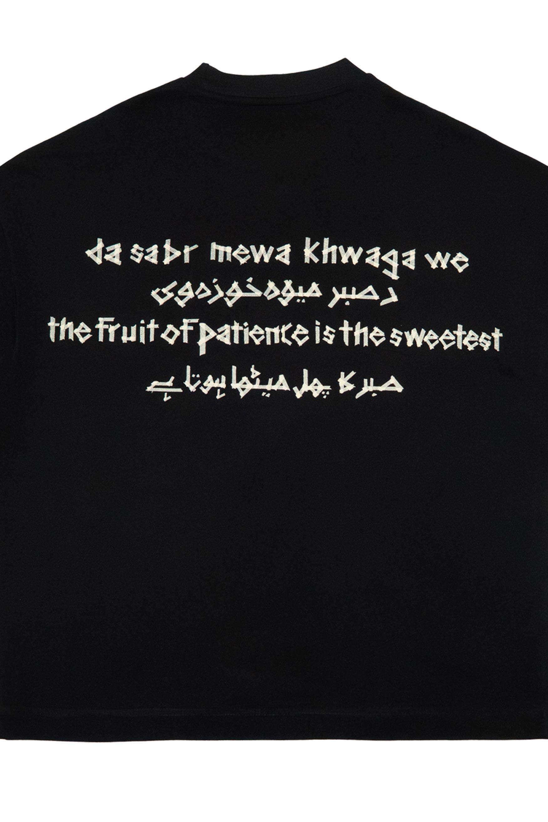 Cultural Quote Design – Back print featuring “Sabar ka phal meetha hai / The fruit of patience is the sweetest / Da sabar mera khwaga we”.