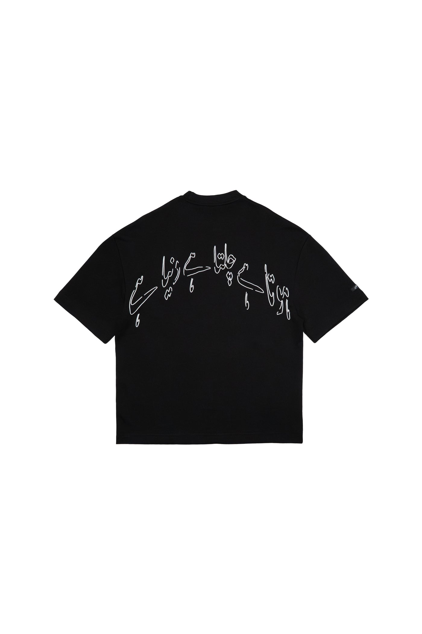 Printing: Mustard eye artwork and block print on front; screen-printed Urdu quote on back