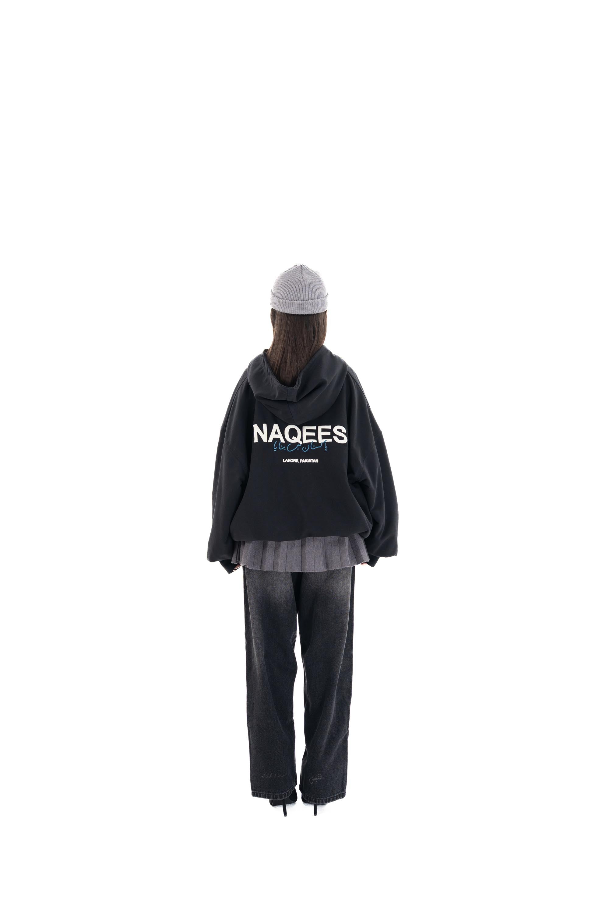 The outer front showcases a crisp screen-printed Naqees logo, strikingly set against the deep black tone. On the back, the Naqees design print anchors the hoodie with bold storytelling, true to the brand’s expressive DNA.