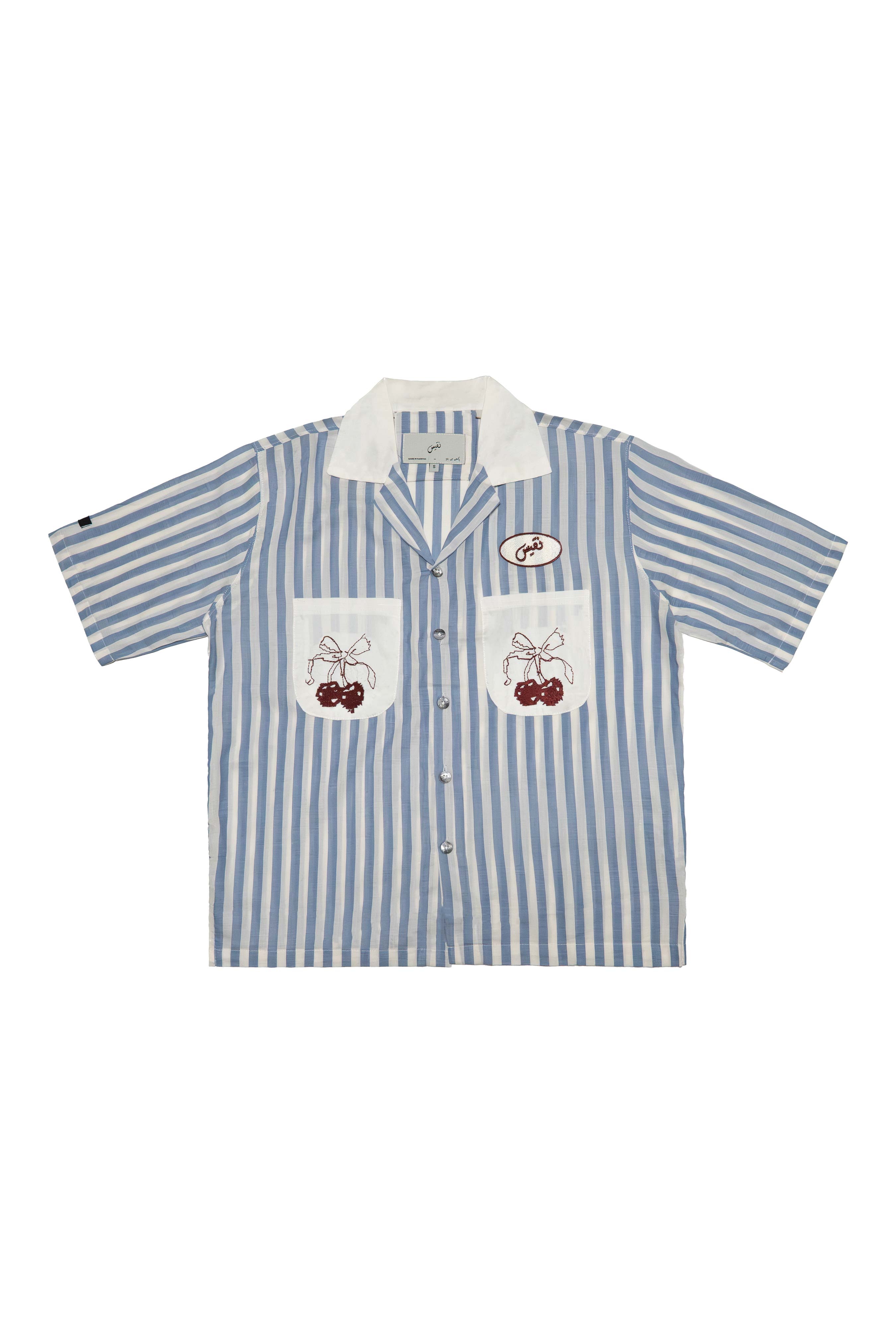 Blending lightweight linen-cotton fabric with thoughtful detailing, the Sky & White Stripe Button-Down Shirt balances sophistication and playfulness. The shirt features dual front pockets embroidered with cherries, adding a touch of whimsy, while a Naqees logo badge embroidered in red thread on the front reinforces identity with bold contrast. A versatile piece, it’s equal parts relaxed and expressive.