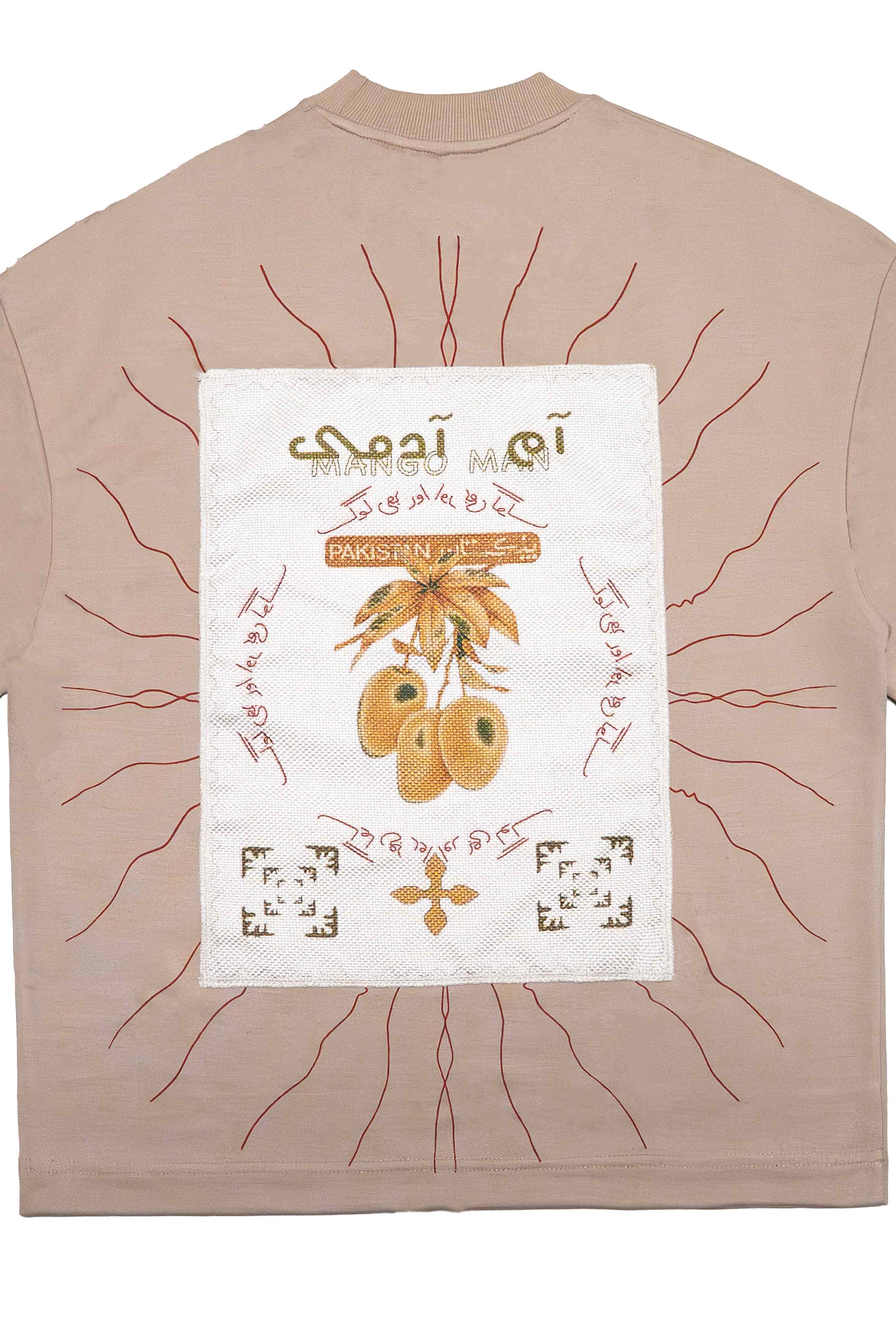 Printing & Embroidery: Urdu Naqees logo with vein-style detailing; digital patch stitched on back with poster-inspired mango artwork
